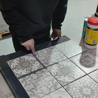 4. หลังจากนั้นใช้ด้ามช้อนรีดที่ร่องยาแนวให้เรียบแบบในคลิป แค่นี้งานก็สวยแล้ว ส่วนเกินที่ดูเลอะเทอะเดี๋ยวพอแห้งแล้วดึงออกง่ายๆ เลยครับ